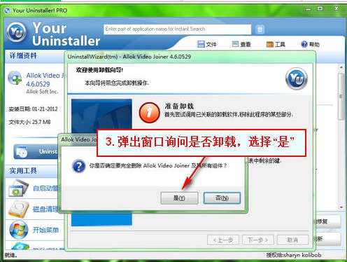 3、弹出窗口询问是否卸载,选择“是”,若是提示有“共享文件”是否卸载?请选“否”;