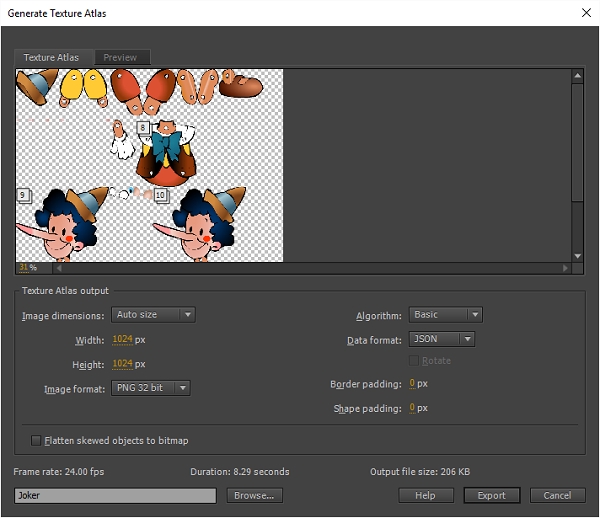 生成纹理图集:动画开发人员可以编排动画并将其作为纹理图集导出到Unity游戏引擎或任何其他喜爱的游戏引擎。开发人员可以使用Unity的示例插件,还可以为其他游戏引擎定制。