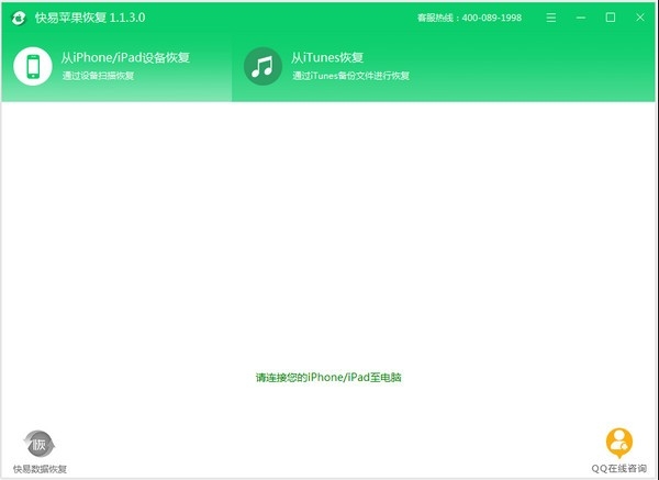 1、从iPhone/iPad设备恢复:启动软件,主界面打开以后,等待连接手机设备,此时您需要以数据线连接好手机设备和电脑: