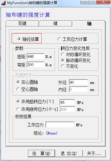 2、如图所示,可以选择轴径估算,在软件下方设置参数,可以设置参数扭矩446.m、弯矩200N.m