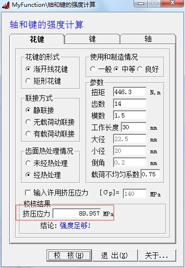 8、校核结果挤压应力89.957mpa,结论:强度足够!