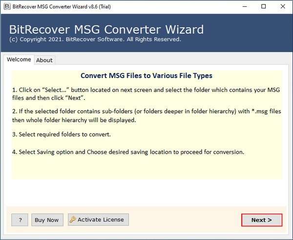 该软件带有易于使用的图形用户界面,因为当您启动 MSG 转换器时,其欢迎屏幕(第一个屏幕)提供了该软件的完整工作指南,以便简单地使用它。技术和非技术用户都可以方便地运行此批处理 Outlook 消息转换器工具。