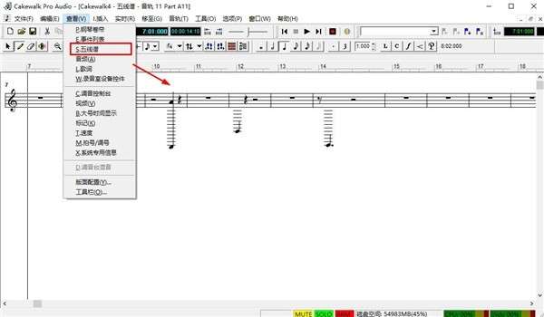 4、基本工作都完成之后,就到了该写乐谱的时候了。右击你想要写谱的音轨,选“五线谱”进入五线谱写谱模式。之后,在工具条上,你可以选择音符的种类,基本音符有全音符、二分音符、四分音符、八分音符、十六分音符和三十二分音符。当然还有一些附加选项,如附点和三连音。选择好你希望的音符种类后,点击工具栏上的铅笔按钮,就可以写谱了。写谱的过程中,如果有误,可以选择橡皮工具擦除,也可以直接用铅笔拖动错误的音符到正确的位置。这需要你有一定的五线谱常识。同时,你也可以随时点击工具栏的“播放”按钮试听效果。试听完成后,请不要忘了点击“倒带”按钮哦