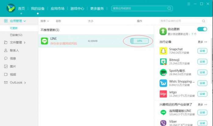 2、点击软件顶部的【我的设备】,然后您可以看到软件左侧的应用管理、文件管理等信息,点击【可更新】,就可以看到可以更新的所有软件,点击【更新】就可以了。