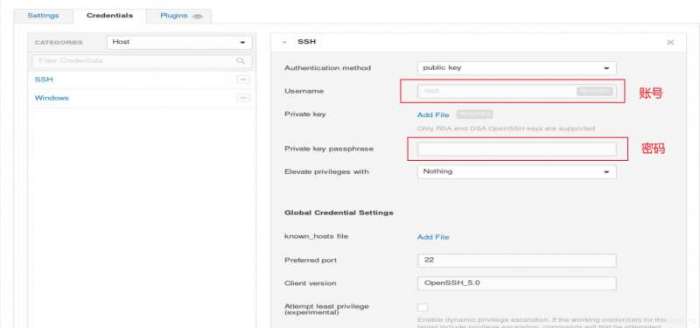 4、如果我们有目标主机的账号、密码,我们可以点击“Credentials”,进行配置。如果是linux系统就配置SSH,windows就配置windows