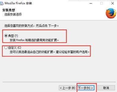 2、选择Firefox浏览器安装类型,根据自身使用情况选择相应的安装类型,选择【典型】安装时推荐一些常用的浏览器功能,选择【自定义】你可以根据自身使用选择一些功能,选择完成后单击【下一步】
