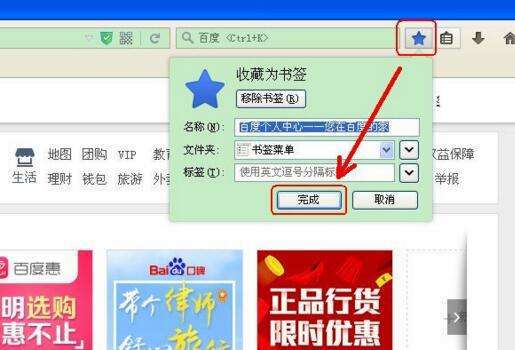 在页面空白处点击鼠标右键,点击收藏标识。或者直接点击工具栏上的收藏按钮,然后点击完成。