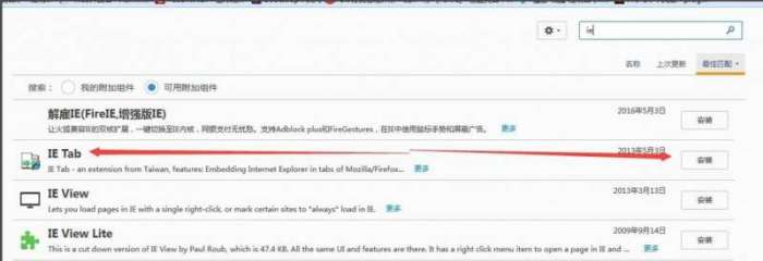 4、然后在搜索结果中会看到“IE Tab”组件,点击右侧的“安装”按钮。