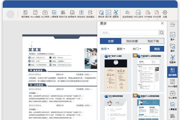 Office助手内置PPT、Word、Excel三种类型的模板,国内顶级设计参与设计,覆盖大部分办公场景。目前素材库中已包含30000+素材,包含PPT模板素材、Word模板素材、Excel模板素材、图片、图表、图标等优质内容。