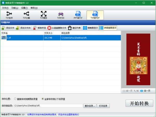 软件中选中“TIF转PDF”功能模块,点击“添加文件”按钮,选择需要转换的TIF文件,可以多选批量处理。支持设置保存位置和目录,设置完成后点击“开始转换”按钮,等待完成即可。