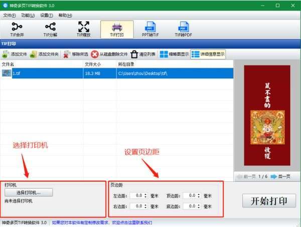 软件中选中“TIF打印”功能模块,点击“添加文件”按钮,选择需要缩放的TIF文件,可以多选批量处理。支持设置选择打印机、设置页边距,设置完成后点击“开始打印”按钮,等待完成即可。