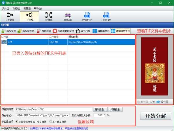 TIF分解功能:将TIF文件分解为多个图片文件,支持设置分解后的图片格式和保存目录;