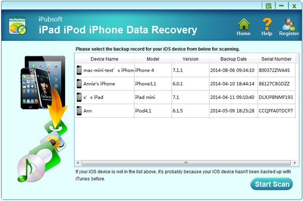 安装并启动该软件后,请在PC上运行它。然后,您将得到一个与计算机上的iTunes同步的设备列表。只需突出显示丢失文件的设备,然后单击“开始扫描”即可从选定的备份档案中提取所有备份数据。