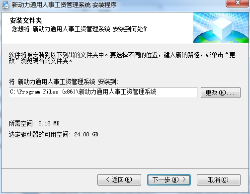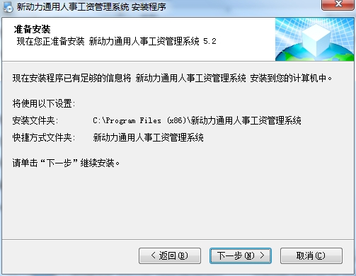 5、安装文件夹选择,默认文件夹“C:Program Files (x86)新动力通用人事工资管理系统”,不要安装在对您的电脑C盘有影响的磁盘上,点击下一步;