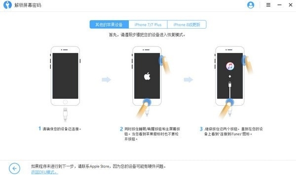 选择设备型号 "其他 iDevices", "iPhone 7/7 Plus" 或 "iPhone 8/8 Plus/X" 。然后按照软件界面说明将设备进入DFU模式。