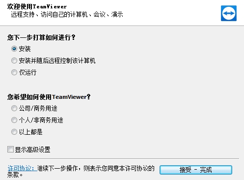 一、首先你需要在该页找到下载地址处选择任意地址将teamviewer14软件包下载至本地,下载后双击解压找到.exe格式程序并运行。根据自己的需求选择安装方式,小编这里将直接选择【安装】并单击【接受-完成】开始安装。