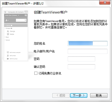 二、我们接着选择【注册】按钮,进入到teamviewer14的注册信息界面,直接根据界面提示输入需要的电子邮件/用户名、姓名、密码等信息。并单击【下一步】