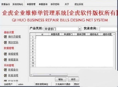 企虎企业维修单管理软件官方版是一款企业维修单管理软件。企虎企业维修单管理软件官方版包含了操作员权限管理、安全管理、单据管理、单据查询、数据备份、数据清理等主要功能模块。企虎企业维修单管理软件可以将软件之外的数据导入进来,方便信息的录入。