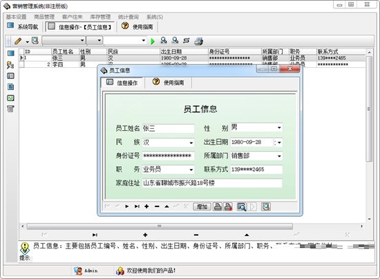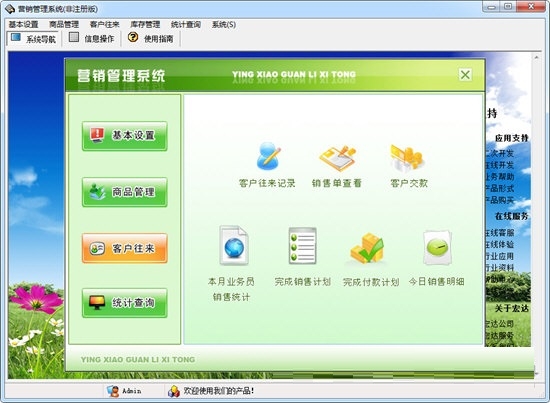 宏达营销管理系统最新版是款应用于中小型市场的市场营销管理工具,宏达营销管理系统最新版主要集基本信息设置、商品管理(商品入库管理、商品入库退货管理)、客户往来管理(产品报价、产品销售、联系反馈回访、客户交款等)、库存管理等功能模块为一体,宏达营销管理系统操作十分简单,是一款易学,易用的软件。