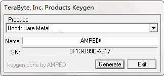 6、打开注册机。产品选择BootIt Bare Metal,点击【Generate】生成一组注册信息