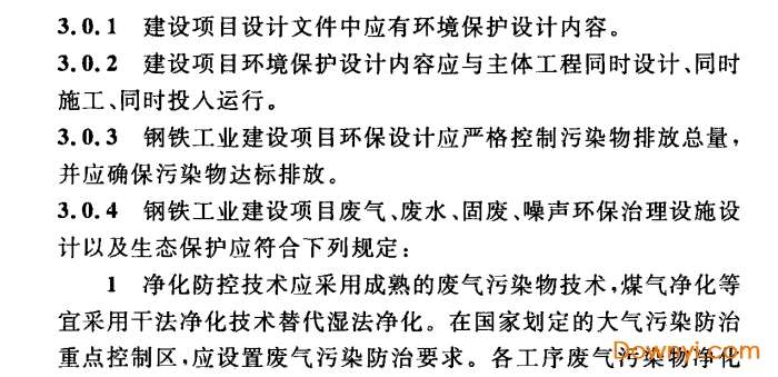 2.钢铁工业已经具有完整的清洁生产指标评价体系以及资源综合利用规范,因此,本次修订中对原规范中属于清洁生产技术或综合利用技术,与环保设施设计无直接关系的内容,进行了适当的删减。本规范修订后重点突出钢铁工业各工序末端治理的设计内容。