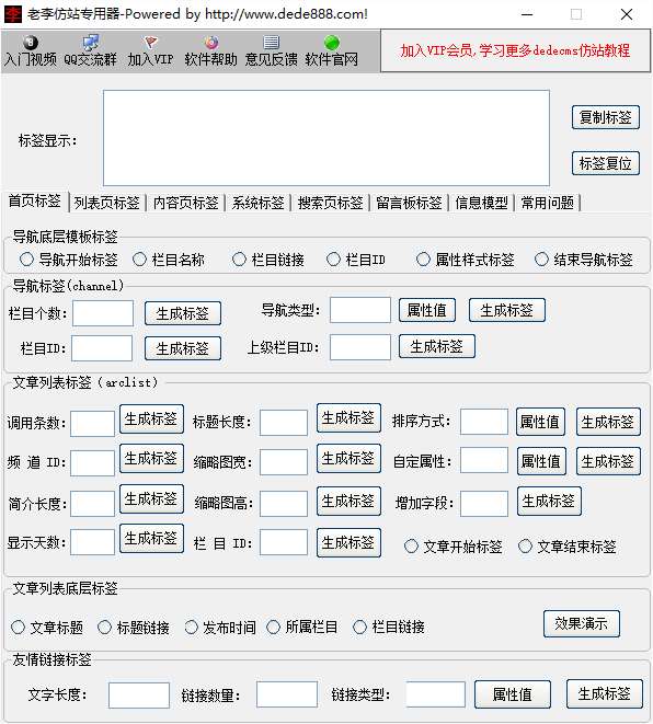 老李仿站专用器dede系统专用仿站工具,主要功能是生根据用户设置生成标签代码,包括首页的导航标签、文章列表、导航底层、文章列表底层,友情链接,还有列表页、内容页、系统标签、搜索页标签,留言板,信息模型。