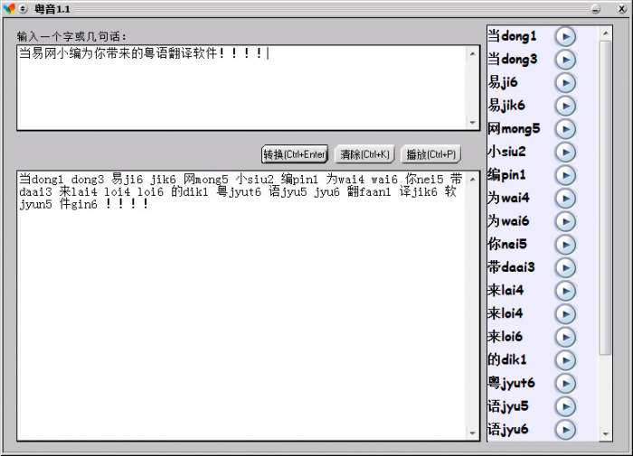 粤音是款学粤语软件,使用方法十分简单,输入中文汉字,然后按CTRL+ENTER键,或者按转换按钮,在窗口的下面窗口中就会出现汉字与对应的粤语发音,左边窗格里也有对应的单字发音,单击后面的播放按钮,可以获得语音发音。按CTRL+P或播放按钮可以整句播放粤语发音,很方便学习。