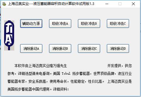 液压蓄能器容积计算软件官最新版由上海迈奥实业开发提供,供您参考,详细选型请来电垂询。美国Tobul 拓步替能器,世界顶级品牌,液压行业蓄能器专家,安全系数高,使用寿命长,性能稳定,性价比高。上海迈奥实业是美国拓步蓄能器中国代理商。