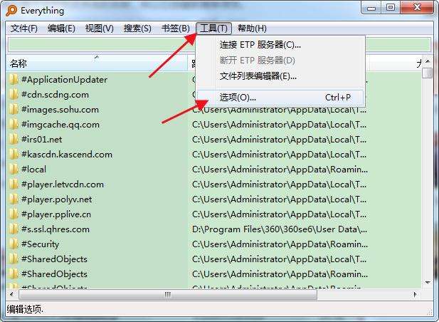 1、打开everything软件的主界面,点击上方状态栏中的“工具”,在下拉中点击“选项”。