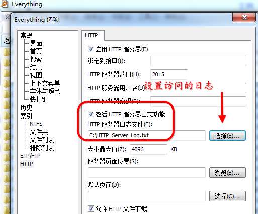 2、在弹出的“everything选项”中选择“HTTP”,“启用HTTP服务器”打勾,然后设置一个http服务器端口。