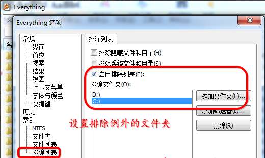 5、再次点击选项中“排除列表”,设置排除例外的文件夹,一般都设置C盘,完事之后点击确定就完成了。