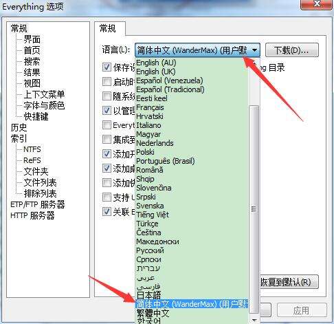 2、然后会弹出“everything选项”,在常规界面的上方就会看到“语言”,点击下拉按钮选择“简体中文”,然后再点击“确定”就可以了。