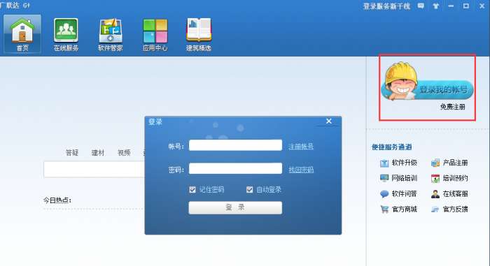 3、您可以点击广联达G+软件【在线服务】,在打开的在线服务窗口中您可以进行搜索答案,提问等操作。