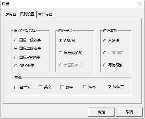 3、而在“识别设置”中,我们可以选择文通手写板的识别字库、内码平台和内码转换功能。