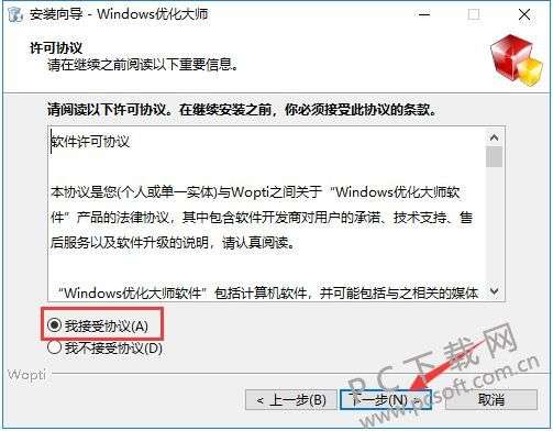 2、进入windows优化大师安装许可协议界面,您可以先阅读协议中的条款,阅读完成后,点击“我接受”然后点击【下一步】。