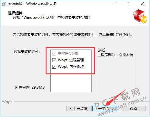 3、选择windows优化大师安装组件,选择完成后,点击【下一步】。