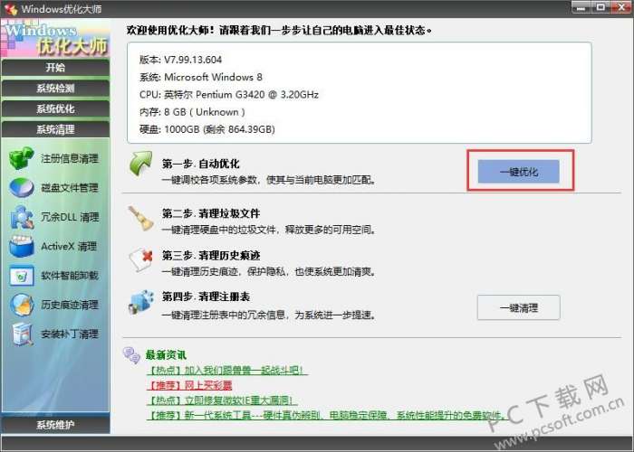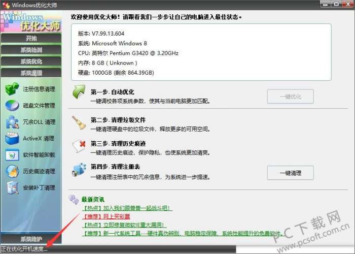 windows优化大师是一款功能强大的系统工具软件。windows优化大师可以帮助用户清理电脑清理电脑磁盘空间,多余的DLL文件和注册信息等,提高了电脑的运行速度,节省了电脑存储空间,软件操作简单,功能强大PC下载网为您提供windows优化大师下载,欢迎前来下载。