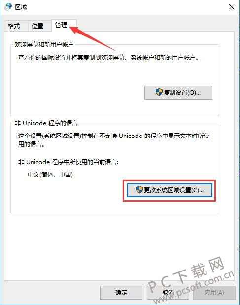 2、打开区域窗口后,将顶部的选项栏切换到【管理】,然后点击下方的【更改系统区域设置】按钮。