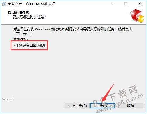 5、勾选创建windows优化大师快捷方式,然后点击【下一步】。