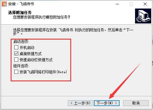 4、根据需要选择“开机启动、桌面快捷方式、快速启动栏快捷方式、安装飞鸽网络打印机组件”等附加任务,点击【下一步】继续安装