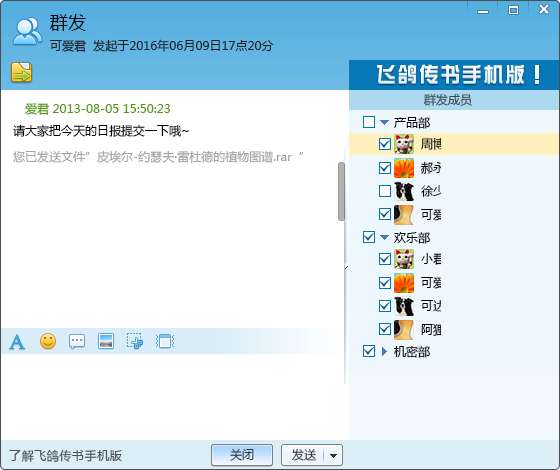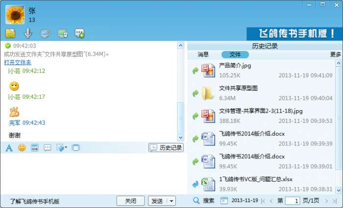 1.讨论组模块也在飞鸽传书中做了很多改进,已经完全支持讨论组的消息和文件收发,并且可以随时查看消息和文件的收发记录。