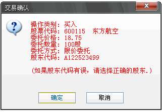 在填写完证券代码之后,证券名称会显现,当确认输入无误之后,点击下单会出现确认信息。