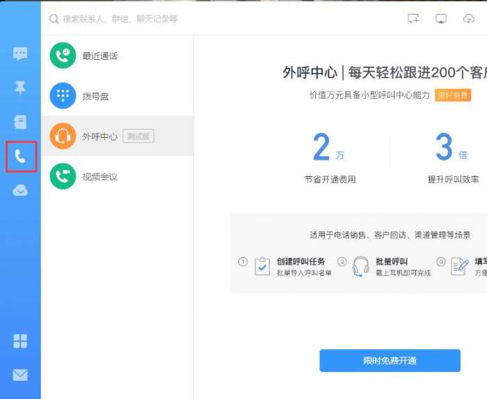 8、点击第四个选项,这个是钉钉电脑版免费电话的功能,可以看到最近通话、会议视频等功能。