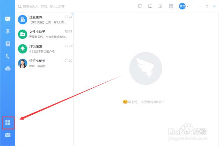 1、首先打开钉钉电脑版的主界面,点击左下角四个方框的选项,如图所示。