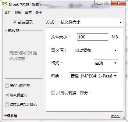 Moo0 VideoResizer这个软件使用非常简单,设置好想要压缩到多大,把视频拖入即可。来自本站用户二狗子推荐。Moo0视频压缩器使你以最简单的方式改变任何视频的“文件大小”或“图像大小”。你是否曾经需要最小化你的视频文件的大小?它太大了?但不想使用任何复杂的软件? 如果这样,此工具可能是最简单的解决方案。