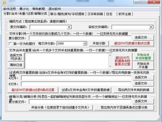 分割:将数量巨大的列表文件,如:旺旺列表,邮箱列表等,快速分割成多个文件,每个文件包含相同条数的记录;