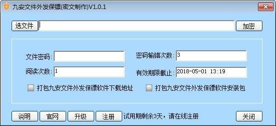 用鼠标双击桌面快捷图标,或用鼠标右键点击一个文件,执行弹出菜单[九安外发保镖(密文制作)],打开软件主界面,设置阅读次数、有效期限、文件密码、密码输错次数。