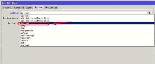 4、还是在当前界面中,将选项卡切换到action【执行动作】设置选择dst-nat选项。