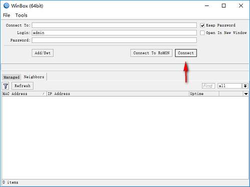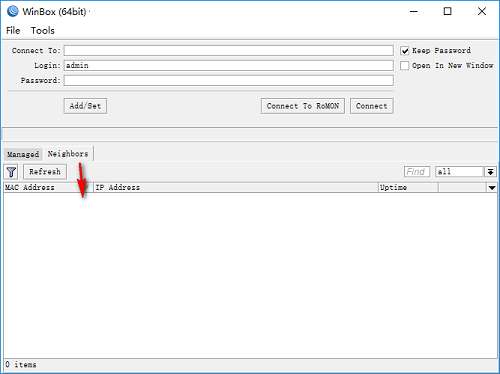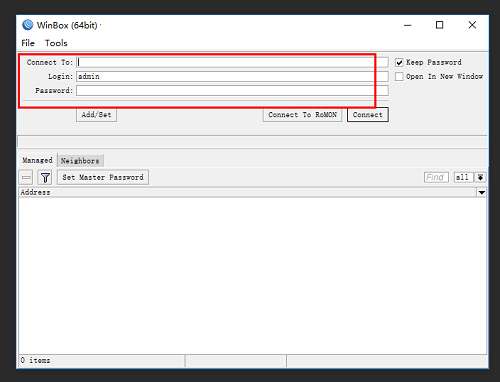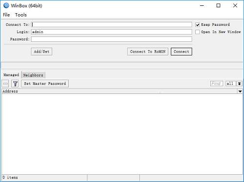 1、运行Winbox,进入如下所示的软件主界面。
