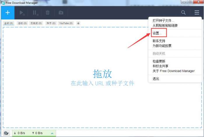 1、打开我们的FDM下载器,然后点击右侧的三条杠的图标,在下拉菜单中选择“设置”点击进入。
